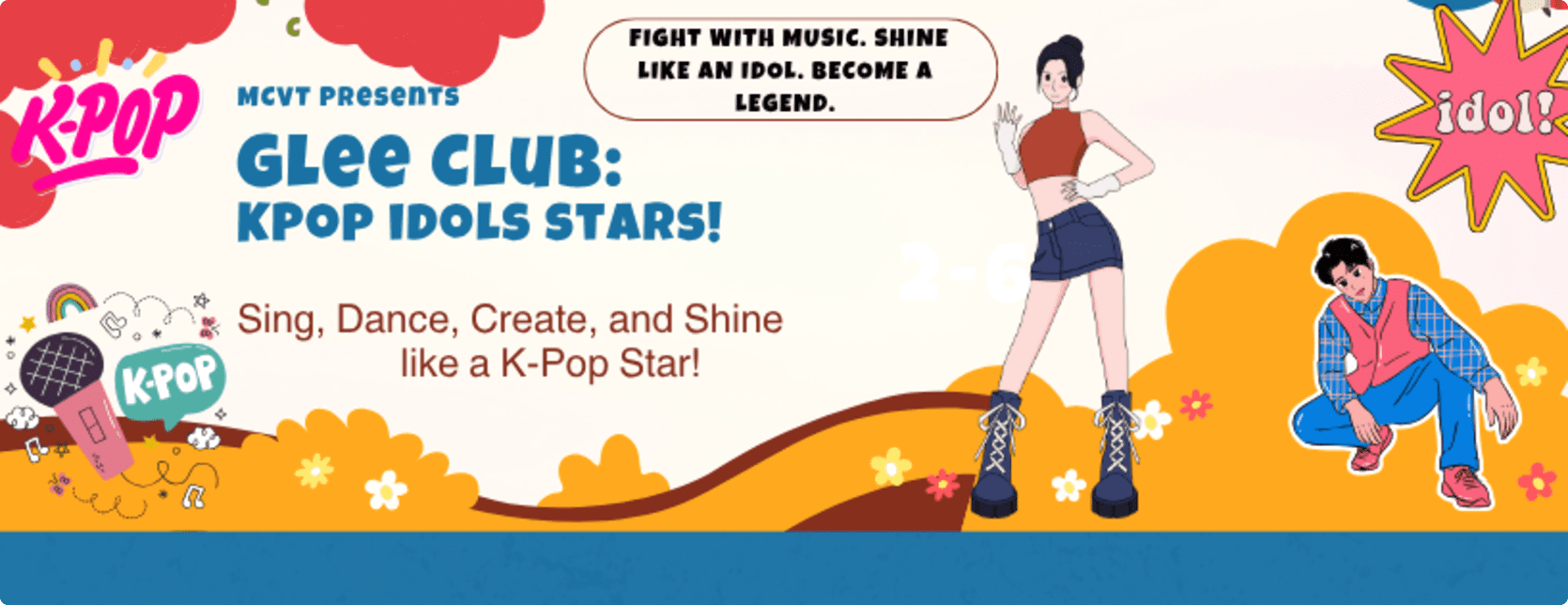 DescriptionGet ready to shine like a K-Pop star! In this upbeat class, young performers sing along to fun K-Pop songs, learn easy dance moves, and create their own props and accessories. Each week brings singing, movement, and creativity as kids build confidence, stage presence, and teamwork. The session ends with a Showcase where our little idols take the stage and shine bright!